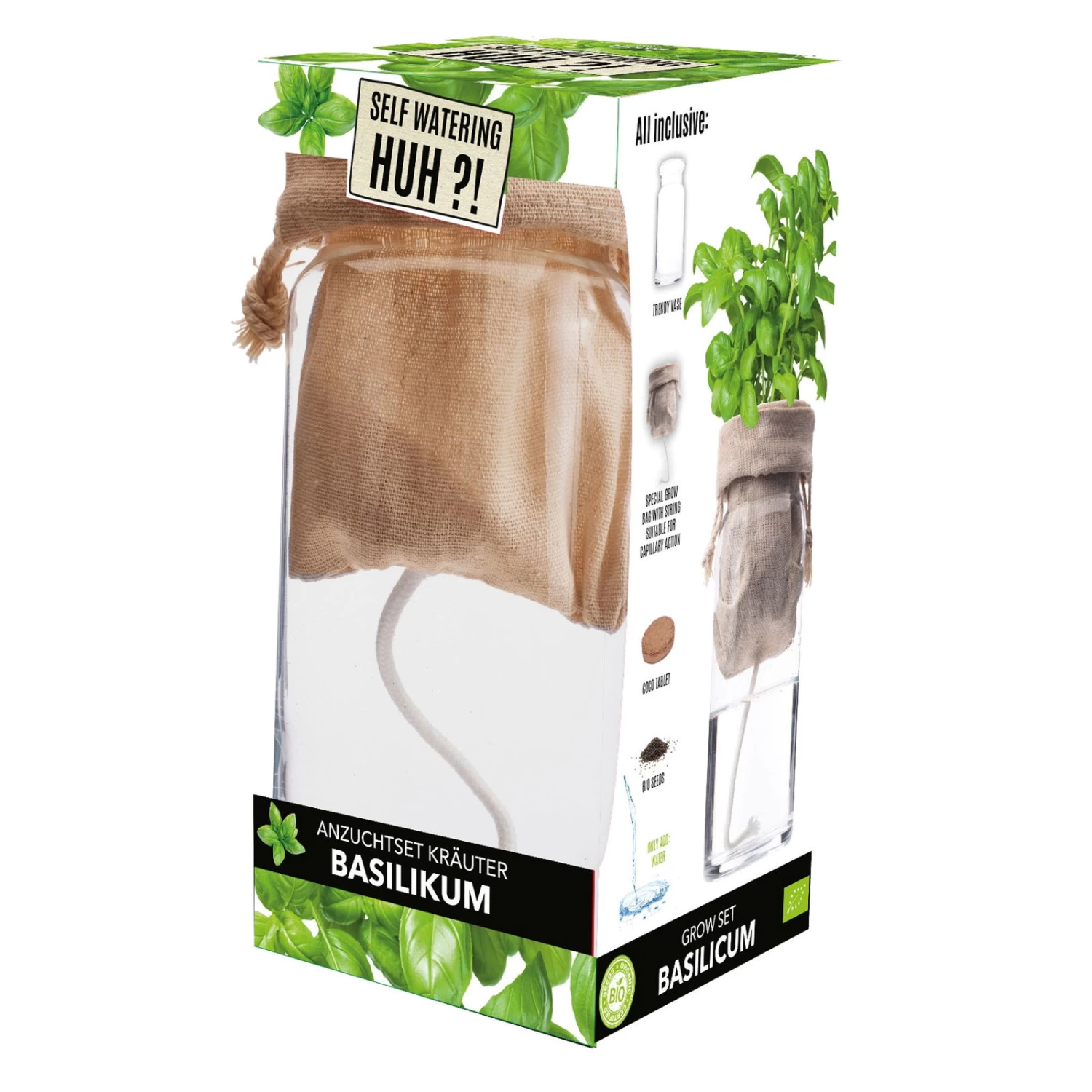 Das Anzuchtset ‚Huh!?‘ stellt physikalische Gesetze scheinbar auf den Kopf und begeistert mit außergewöhnlicher Optik. Durch eine Schnur mit Kapillarwirkung steigt das Wasser aus dem unteren Gefäß hoch und hält das Substrat feucht. Für das frische Bio-Basilikum entstehen auf diese Weise optimale Bedingungen.