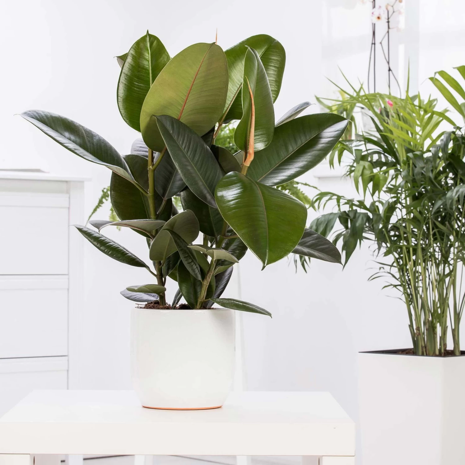 Für Hobbygärtner und Pflanzenfreunde, egal ob mit oder ohne grünen Daumen, ist der Gummibaum, Ficus elastica ‚Robusta‘ die ideale Zimmerpflanze. Die moderne Grünpflanze ist aufgrund ihrer leichten Pflege überaus beliebt und eignet sich daher hervorragend als Zierpflanze für Wohnungen, Geschäftsräume und Treppenhäuser. Dank der großen und tiefgrünen, glänzenden Blätter ist der Gummibaum ein angesagtes Wohnaccessoire, das in keinem Haushalt fehlen darf. Bei Pflanzen-Kölle können Sie den Gummibaum kaufen und an einem hellen und halbschattigen Plätzchen aufstellen. Damit die Blätter des Ficus elastica robusta eine kräftige Färbung annehmen und besonders gut gedeihen, dürfen Sie den Gummibaum auch für ein paar Stunden ins direkte Sonnenlicht stellen. Achten Sie bei der Pflanzenpflege des Gummibaumes zusätzlich auf einen feuchten aber nicht zu nassen Boden, da bei zu viel Wasser die Blätter abfallen können. Der Ficus elastica ‚Robusta‘ ist ein Klassiker unter den Zierpflanzen und heutzutage beliebter denn je.